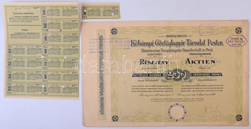 Budapest 1922. "Kőbányai Gőztéglagyár-Társulat Pesten" részvénye 200K-ról bélyegzésekkel, szelvényekkel, lyukasztással érvénytelenítve T:III / Hungary / Budapest 1922. "Brick Factory of Kőbánya in Pest" share about 200 Kronen with stamps, coupons, cancelled by holes C:F