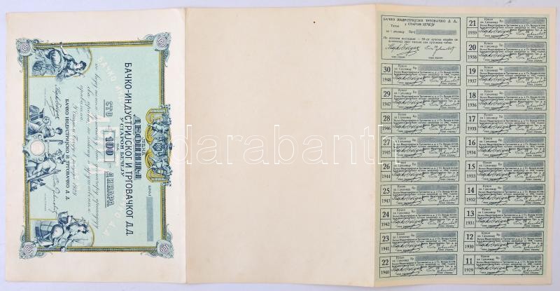 Jugoszlávia / Stari Becej (Óbecse) 1929. "Bácskai Ipar és Kereske... https://www.darabanth.com/en/36-Major-auction/36.1/Numismatics/Shares-Securities-and-Tickets~15171/Jugoszlavia-Stari-Becej-Obecse-1929-Bacskai-Ipar-es-Kereskedelmi-Reszvenytarsasag-re~II2491466