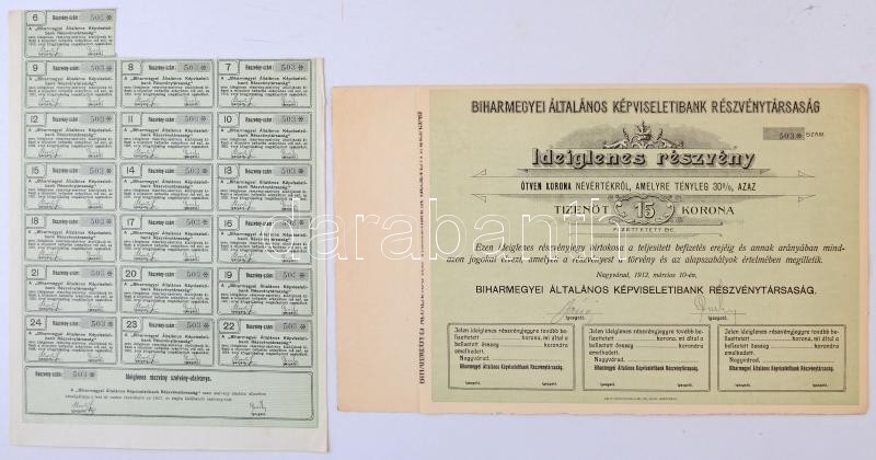 Nagyvárad 1912. "Biharmegyei Általános Képviseletibank Részvénytársaság" ideiglenes részvény 15K-ról, szelvényekkel T:I- kis szakadás / Hungary / Nagyvárad (Oradea) 1912. "Biharmegyei Általános Képviseletibank Részvénytársaság" provisional share about 15 Korona with coupons C:AU small tear