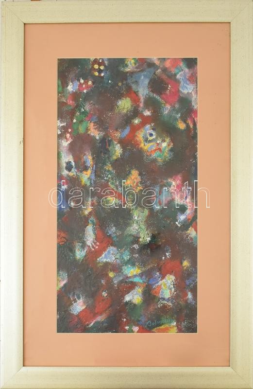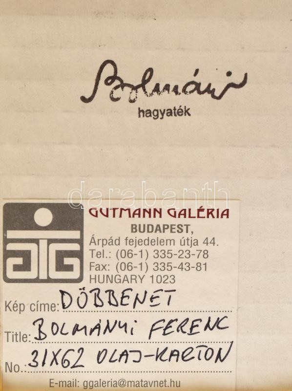 Description: Bolmányi Ferenc (1904-1990): Döbbenet. Olaj, karton, jelzett. Hátoldalán "Bolmányi hagyaték" bélyegzővel és Gutmann Galéria, Bp. címkéjével. Üvegezett fa keretben, 62×31 cm / Oil on board, signed, with the artitst's estate stamp and Gutmann Galéria (gallery) label on the reverse, framed.