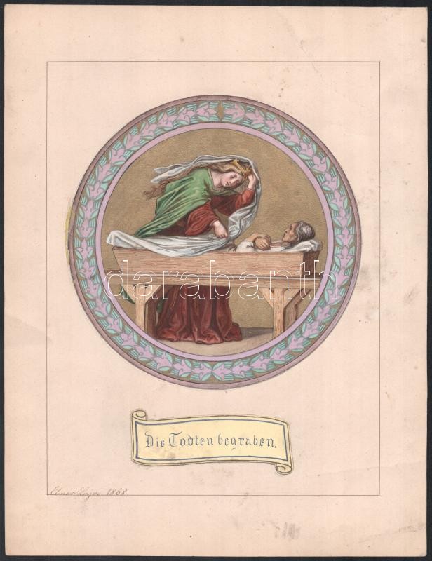 Deák Ébner Lajos (1850-1934), 3 db mű: Árpádházi Szent Erzsébet betegeket gyógyít, szomjasaknak inni ad, halottakat temet, 1868. Vegye technika, papír, papírra kasírozva. Mindegyik jelzett és datált: Ebner Lajos 1868. Proveniencia: Kézdi-Kovács László (1864-1942) festőművész és műkritikus gyűjteményében, majd fia, Kézdi-Kovács Elemér (1898-1976) gyűjteményében és hagyatékában. 3x26x20 cm. Deák Ébner Lajos 1868-tól volt a müncheni akadémia diákja, nem ismert, hogy ezeket a rajzokat még Pesten vagy már esetleg a bajor fővárosban készítette. Feltételezhetően üvegablak tervek vagy illusztrációként szolgáltak. Valószínűleg a művész legkorábbi, valaha aukción szerepelt alkotásai!