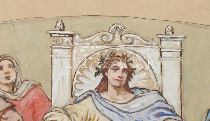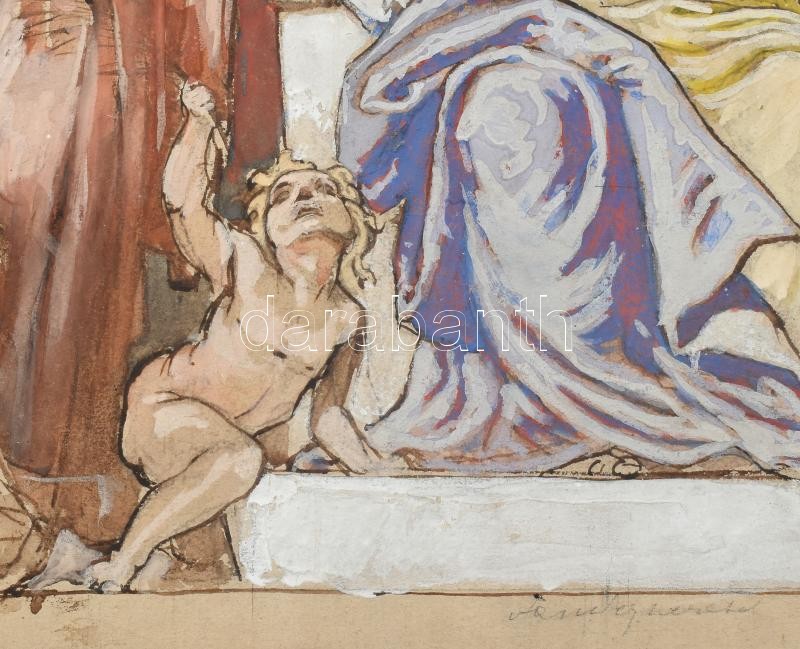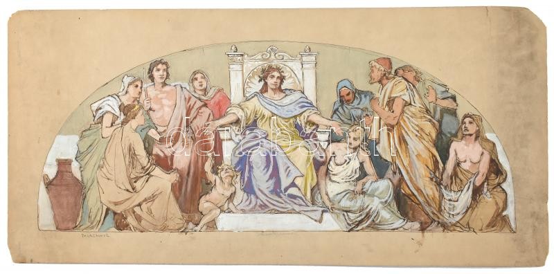 Description: Deák Ébner Lajos (1850-1934): Történelmi jelenet, 1870 körül. Gouache, karton. Jelzett. Proveniencia: Kézdi-Kovács László (1864-1942) festőművész és műkritikus gyűjteményében, majd fia, Kézdi-Kovács Elemér (1898-1976) gyűjteményében és hagyatékában. Karton jobb felső sarkában sérült, ábrázolást nem érintve. Sarkaiban kisebb hiányokkal. 26x67 cm