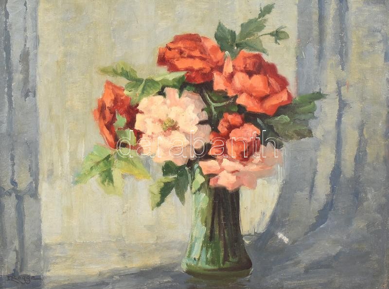 Emy Rogge (1866-1959), német festőnő, működött 1922-től Worpshausenben, Worpswede mellett: Csendélet. Olaj, vászon. Kissé sérült fa keretben, 46x60 cm / Emy Rogge (1866-1959), German painter, worked from 1922 on in Worpshausen, near Worpswede: Still life. Oil on canvas. Framed, 46x60 cm