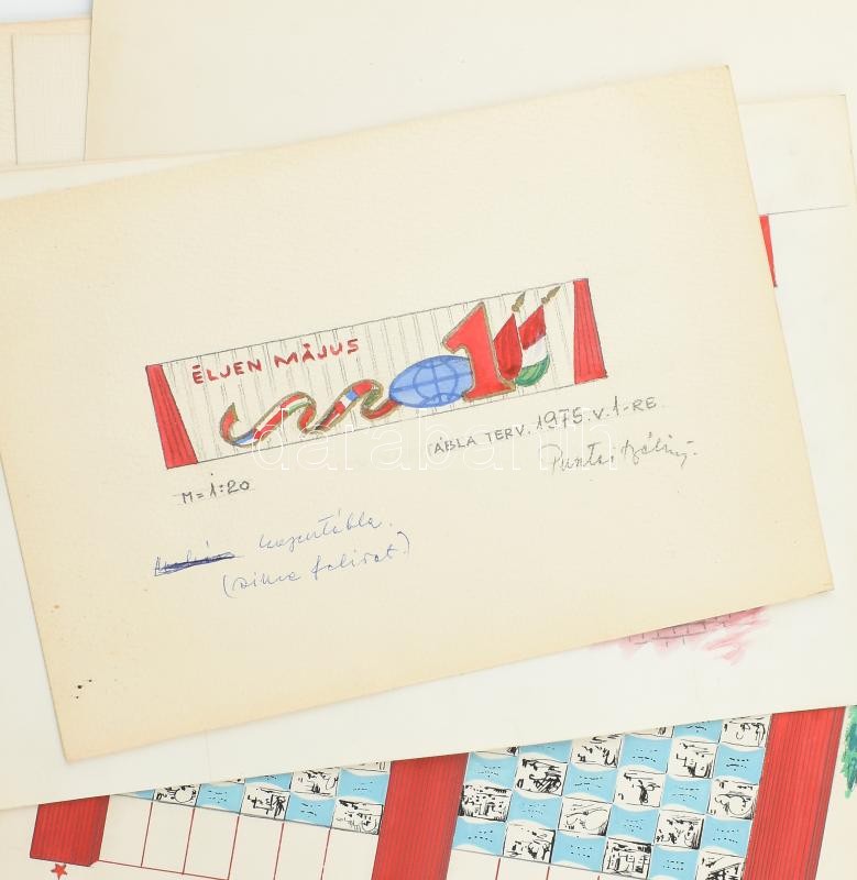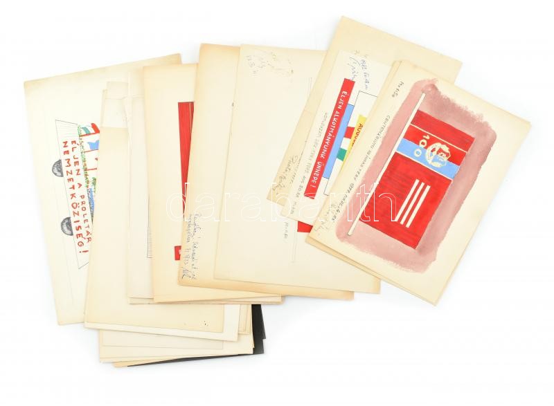 Pusztai Bálint jelzéssel: Egy mappányi szocreál plakát- és dekorációterv, különféle szocialista jubileumokhoz, cca 1970-1985. Vegyes technika, nagyrészt jelzett, feliratozott, különböző (30x20 cm körüli) méretben