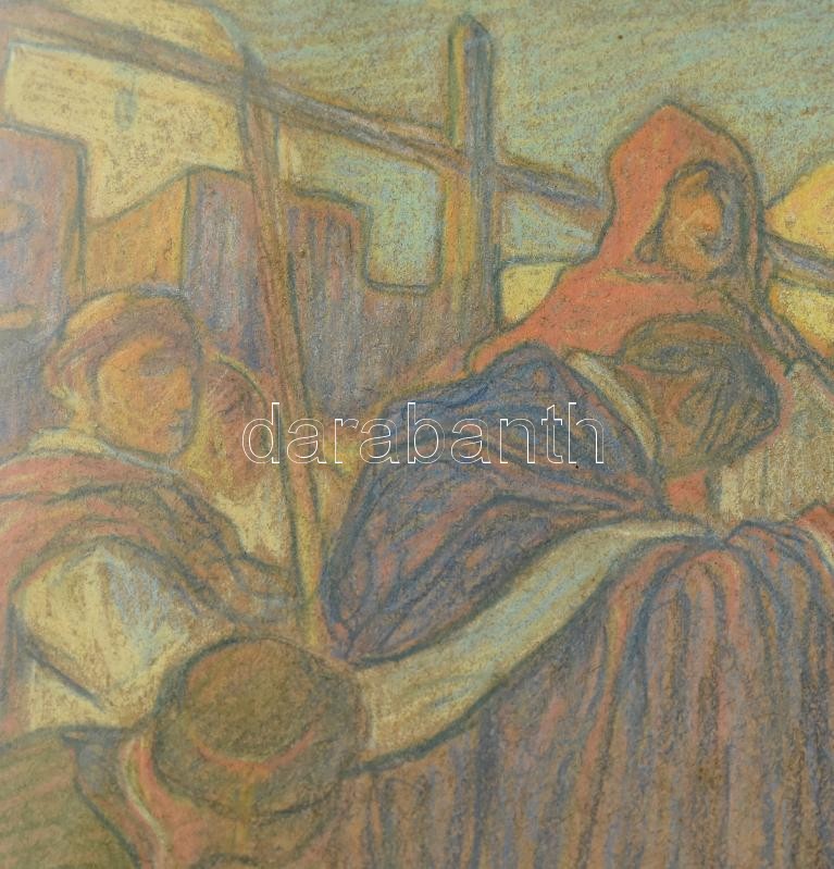 Udvary Géza (1872-1932): Szent István templomot alapít. Pasztell, ceruza, papír, jelzett. Hátoldalán feliratozott. Proveniencia: Kézdi-Kovács László (1864-1942) festőművész és műkritikus) gyűjteményében, hátoldalán autográf feliratával, majd fia, Kézdi-Kovács Elemér (1898-1976) gyűjteményében és hagyatékában. Üvegezett, sérült keretben, 22×62 cm