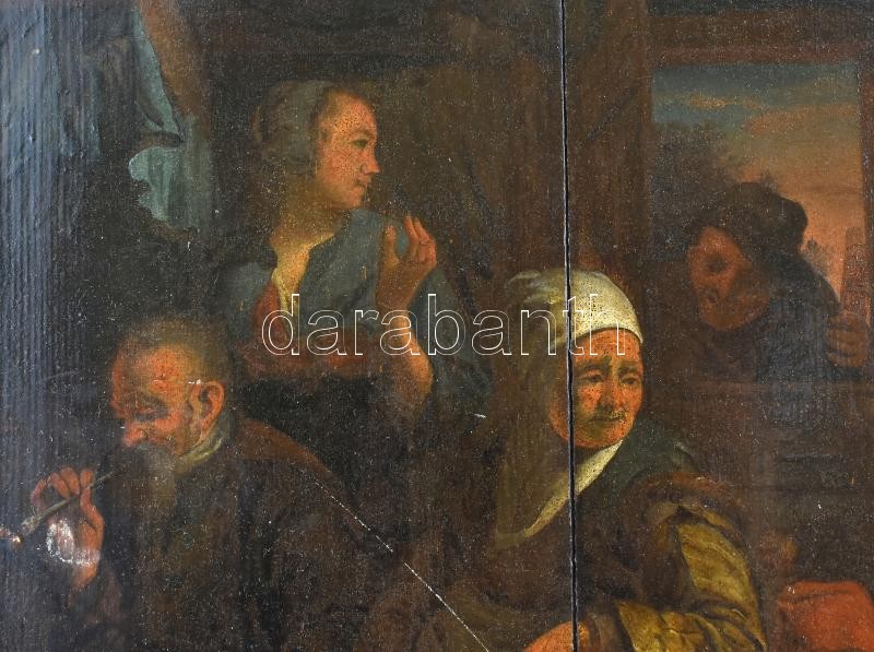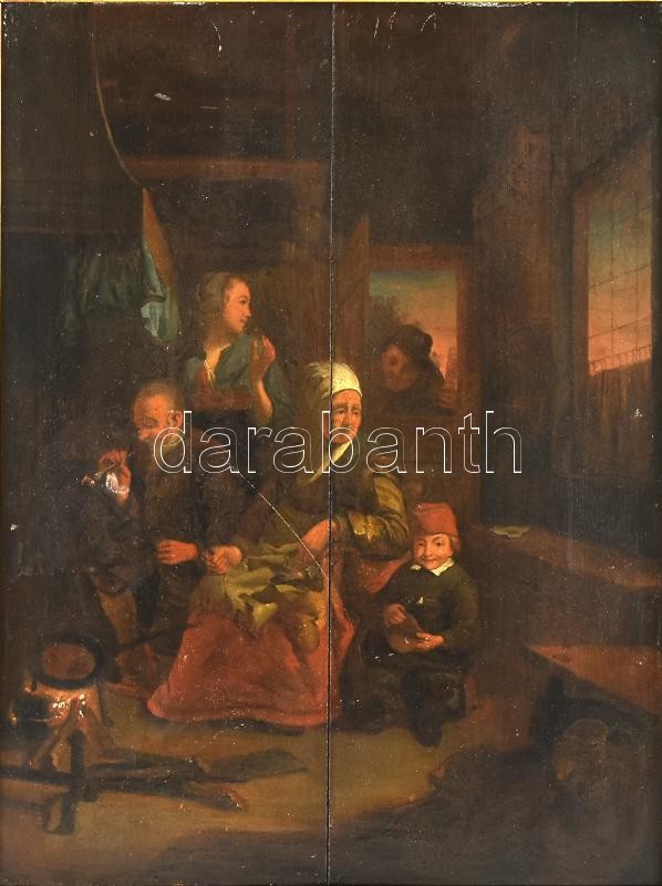 Description: XVII. vagy XVIII. sz. holland festő alkotása, jelzés nélkül (Adrian van Ostade köre?): Család. Olaj, fatábla. Sérült. Fa keretben. 51x40,5 cm / XVII. or XVIII. century Dutch painter, unsigned (circle of Adriaen van Ostade?): Family. Oil on wood. Damaged. Framed. 51x40,5 cm