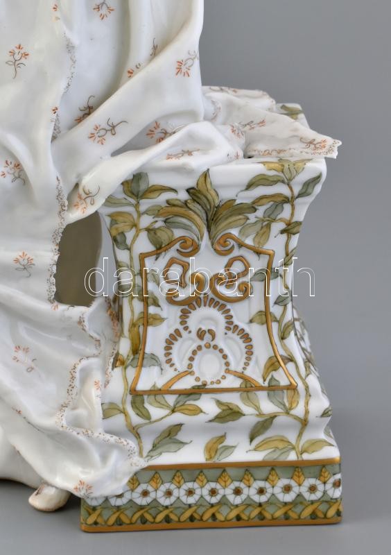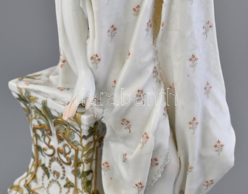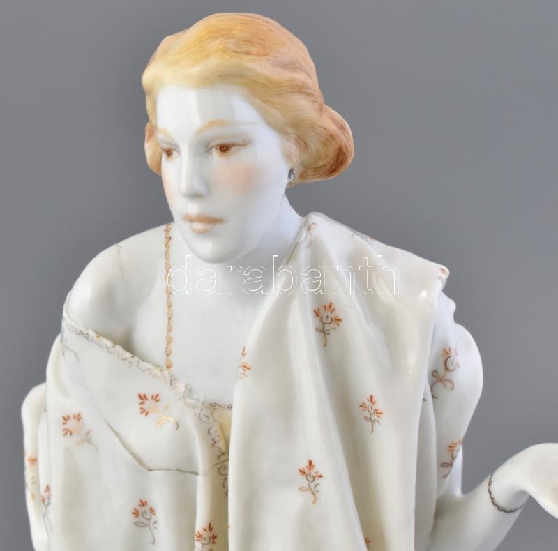 Herendi. Szávoszt Katalin (1941- ): Afrodité. Színesen, kézzel festett porcelán, jelzés nélkül, tűzrepedésekkel, m:29cm Egyedi művész példány! Gyűjtői darab. "Nők kertje címen 1996-tól készítek porcelán plasztikákat. Női figurákat, "akik" ülnek, állnak, pihennek ágyakon, különböző párnákon. Ez egy női világ mindazokkal a tulajdonságokkal, amelyek szerintem a női lét sajátjai: a természetesség, kedvesség, némi erotika és könnyed szerepjátszás. Ennek a vonulatnak a folytatása a most bemutatott Herendi áttört oszlopon ülő kalapos lány, a szélfútta, hosszú ruhás, távolba néző és láblógató társa, a párnán heverésző, hosszú hajú és a labdán ülő cirkuszi fiatal lány. Mindegyik egy-egy pillanatot őriz, az elengedettség, a merengés pillanatát, ami oly fontos egy nő életében. Ezek a harmónia, a magába feledettség percei, egyben a dolgok kisimításának ideje is. A figurák a megelőző periódushoz képest felöltöztek. Ruhát viselnek, az alkalomhoz illő, örök darabokat. Amikor 1999 elején megkaptam a lehetőséget, hogy a Herendi-masszát kipróbálva figurákat alkossak, mintegy 38 különböző alak készült. Ezekből születtek meg a mostaniak. Sok rajz, dekortery, anyagvázlat előzi meg az eredményt, és főleg sok-sok közös munka kiváló herendi szakemberekkel. A figurák öntéssel készülnek, míg a rájuk kerülő drapéria szabad kézzel. Ezzel a sajátos technikával tudunk eljutni a porcelánanyag vékonyságának és áttetszőségének lehetséges határáig. A szabadkézi technikával egy koreográfián belül ismételhetők a mozgást követő redők, fokozva az egyediséget. A dekornál igyekeztem maximálisan ,,élni" hagyni a porcelánt és az anyagredőket. Így a felülethez alkalmazkodni képes rajzos dekorokat terveztem." Szávoszt Katalin