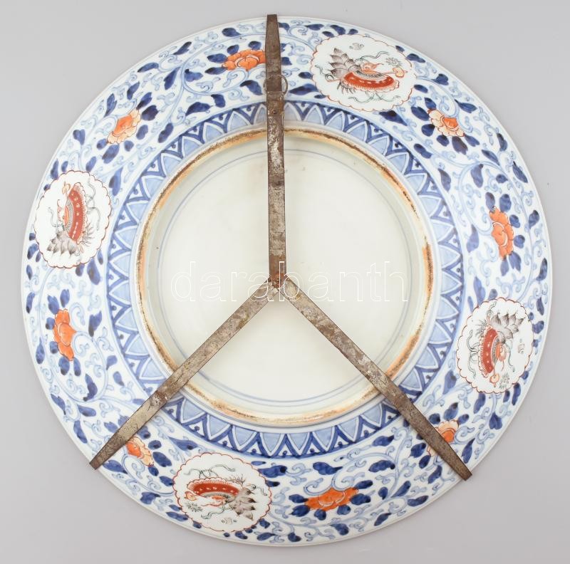 Description: Imari tál porcelán, öblében máz alatti kékkel, máz felett vörössel és arannyal festett virág és fookutya ábrázolással. Korának megfelelő kopásokkal. Japán, Arita, Meiji korszak (1868-1912) d: 61 cm