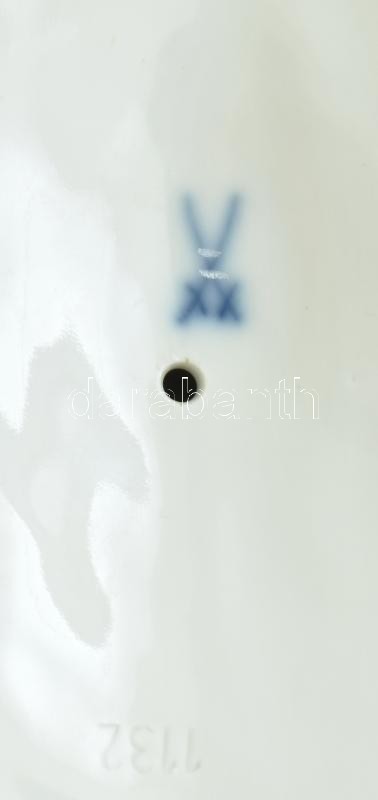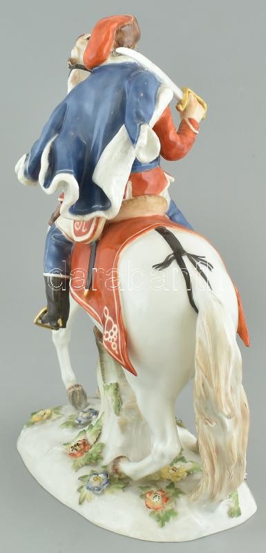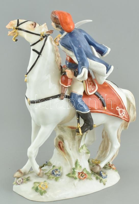 Description: Meissen. Huszár. Egy előretörő fehér lovat egy szőrmekarimás sapkában és kék köpenyben lovagló huszár vezet. Festett porcelán, alján kék kardos jelzettel, 1132 és masszába nyomott 119-es számmal, sérült, restaurált, m: 27 cm