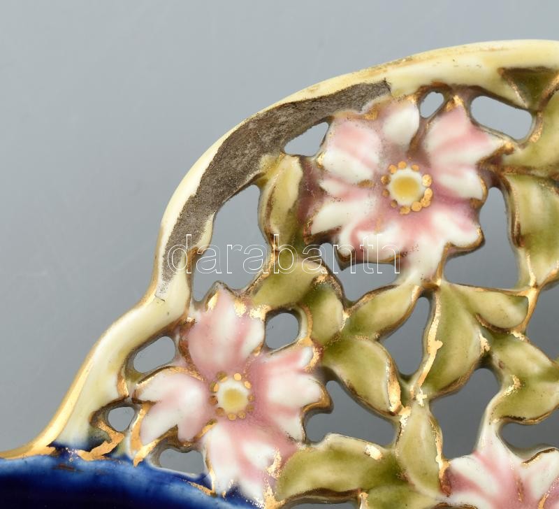 Zsolnay fali dísztál. Korának megfelelő kopásokkal, egy apró gyári tűzrepedéssel valamint csorbával. Színesen festett és aranyozott, alap- és kobaltkék mázas porcelánfajansz áttört és szív alakú osztásokkal, illetve festett virágmintás és krizantémos díszítéssel. Jelzett: 1880-1890 körüli, masszába nyomott Zsolnay Pécs, mázalatti kékkel halványan látszódó családi pecsét és Made in Austria-Hungaria jelzés, valamint 3554-es, 36-os és 50-es formaszámok. d: 30 cm. (CSAK SZEMÉLYES ÁTVÉTEL/ONLY PERSONAL COLLECTION)