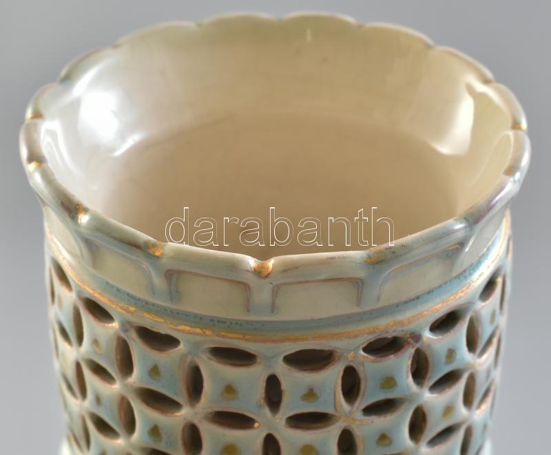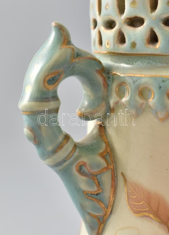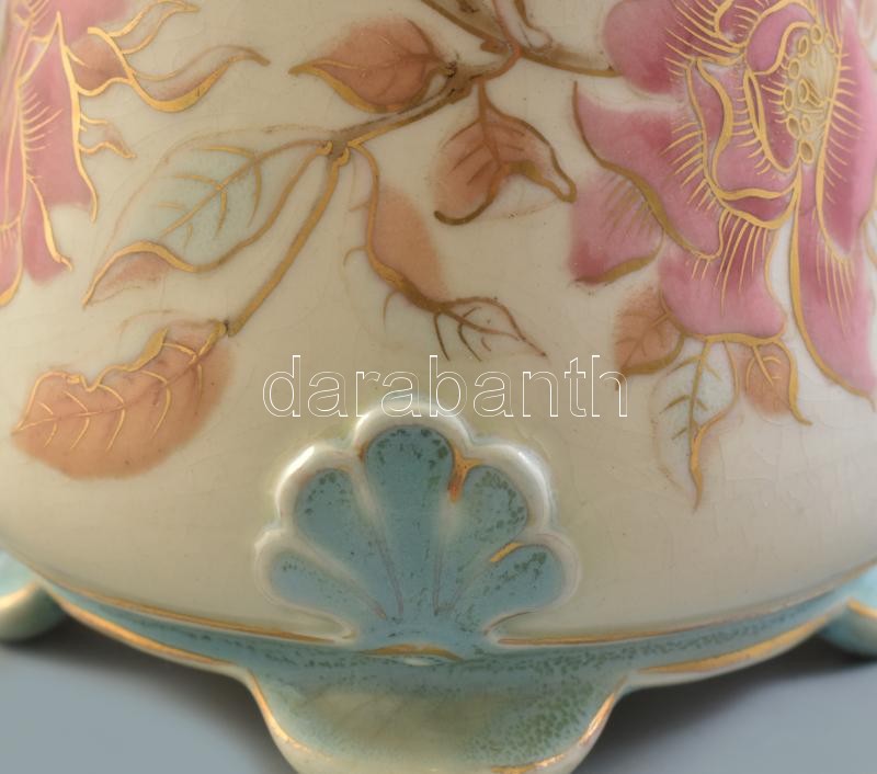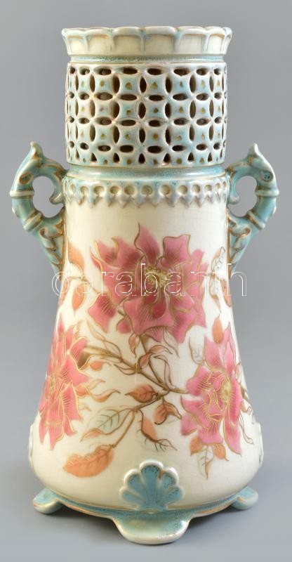Porcelánfajansz, négylábú hengeres forma színesen festett futórózsa mintával, pereme alatt dupla falú rizsszemes áttört díszítéssel. Néhol kristálymázzzal.