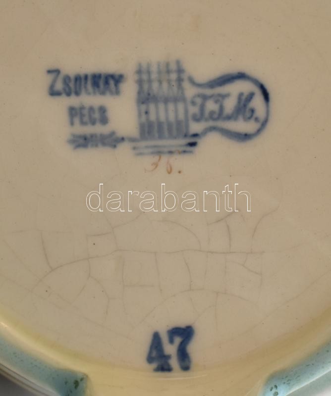 Jelzett: máz alatt kékkel, ZSOLNAY PÉCS TJM öttorony és benyomott ZSOLNAY PÉCS.