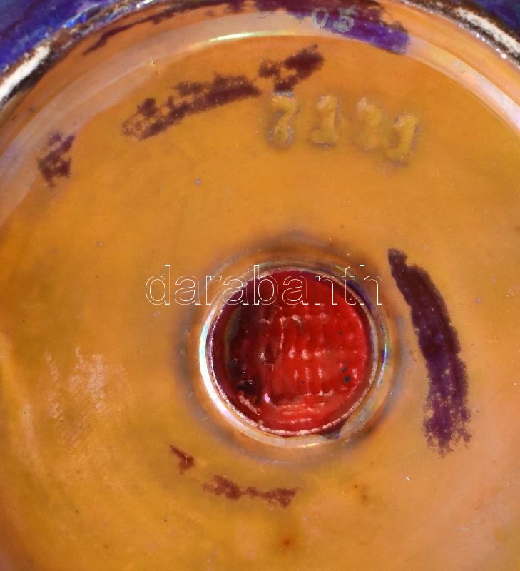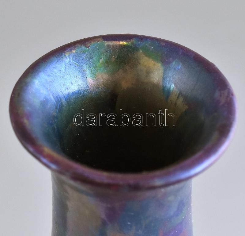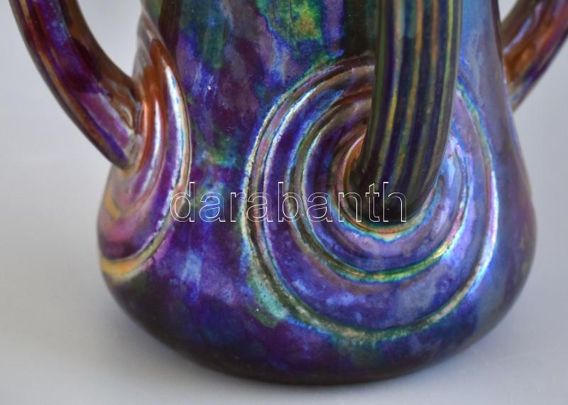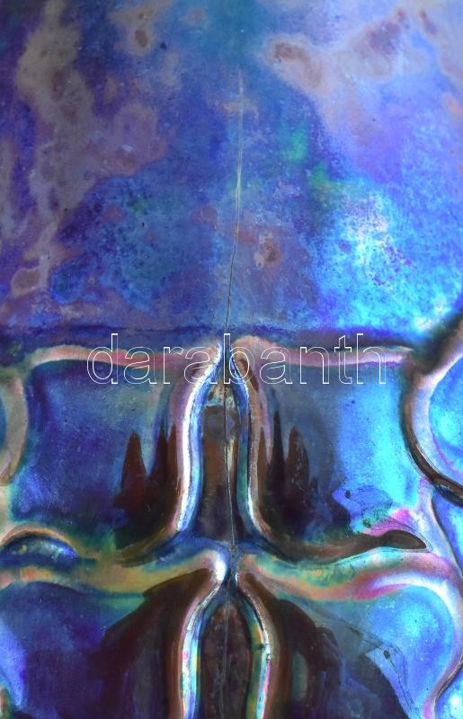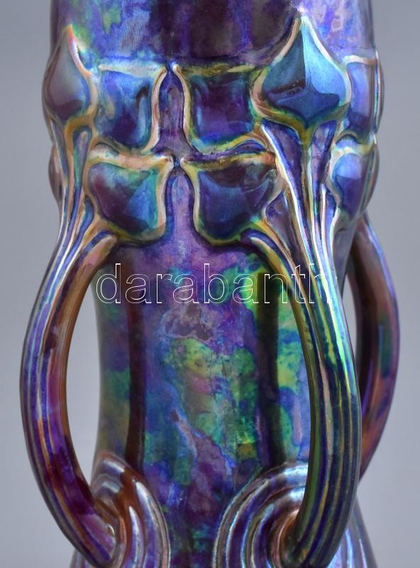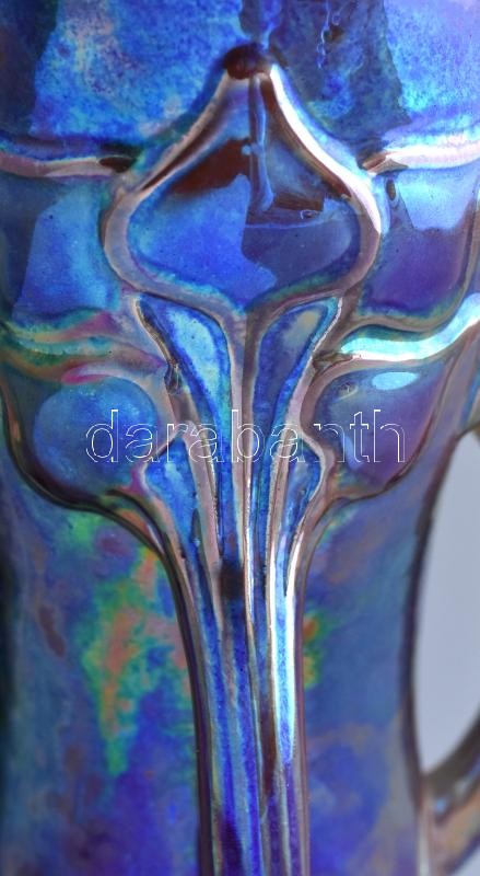 Zsolnay szecessziós díszváza. Fehércserép. Felületén selyem és magas fényű, magas tüzű labradormázzal festett, reliefszerű stilizált virágok. Apáti Abt Sándor formaterve alapján. Alján jelzett: masszába nyomott 7121 (formaszám) és alapmázzal megegyező kerek, domború, pecsétszerű márkajelzés. Zsolnay, Pécs, 1906. M.: 37 cm, restaurált (pótolt), hajszálrepedéssel. (CSAK SZEMÉLYES ÁTVÉTEL)
