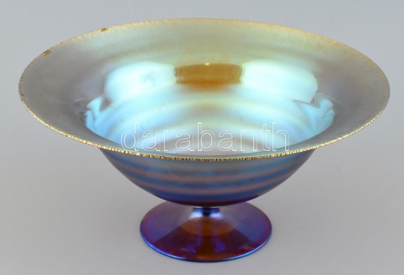 Description: Art Deco dísztál. Fúvott üveg, bordázott felületén irizáló díszítmény. Jelzés nélkül. Peremén apróbb lepattanások. Német, WMF., Geisslingen, Myra sorozat, 1930 körül. m: 12 cm, d: 25 cm