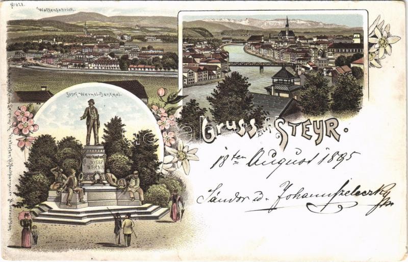 1895 (Vorläufer) Steyr, Waffenfabrik, Josef Werndl Denkmal / statue, military arms factory. H. Nachbargauer Art Nouveau, floral, litho