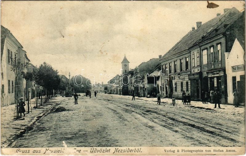 Description: Nezsider, Neusiedl am See; utca, Paur János, Wallenstein Salamon, Stefan Amon üzlete és saját kiadása / Strasse / street, shops (felszíni sérülés / surface damage)
