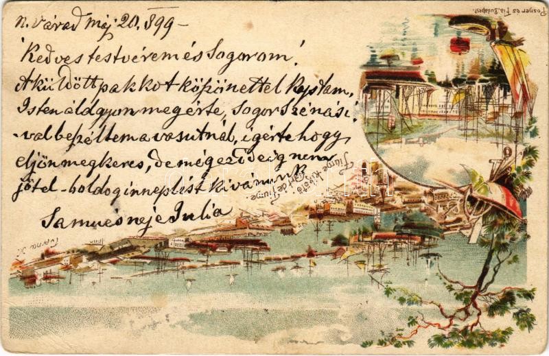 Description: 1899 (Vorläufer) Fiume, Rijeka; Port de Fiume / Fiume kikötője. Országos Ezredéves Kiállítás / Hungarian Millennium Exhibition, port, advertisement. Art Nouveau, floral litho s: Cserna K. + 2 Kr. barna Ga. (EK)