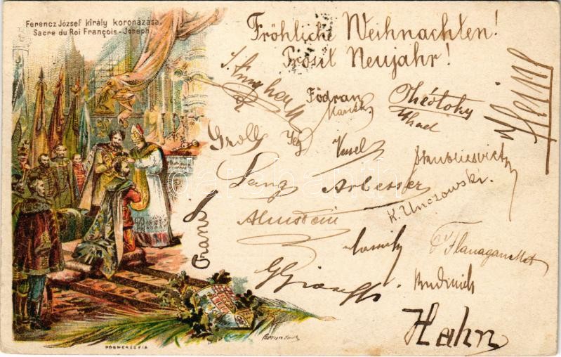 1896 (Vorläufer) Ferenc József király koronázása. Ezredéves Kiállítás / Coronation ceremony of Franz Joseph. barna 2 Kr Ga. litho s: Cserna K.