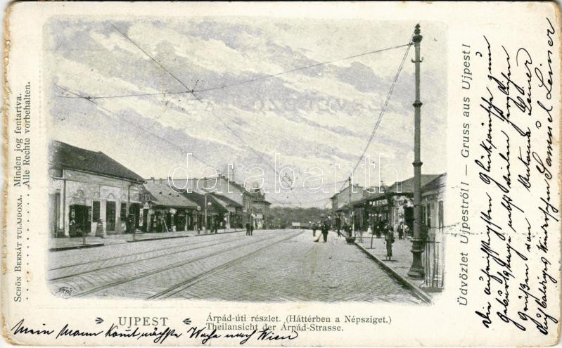 1902 Budapest IV. Újpest, Árpád út háttérben a Népszigettel, villamossínek. Schön Bernát tulajdona (kopott él / worn edge)