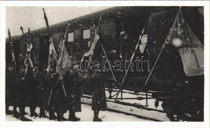 Description: 1941 Lavochne, Lavoczne; az 1848-49-es szabadságharci zászlók ünnepélyes hazahozatala Oroszországból. A zászlók berakása a vonatba a vasútállomáson / Russia returns the flags of the 1849-49 Hungarian war of independence, railway station