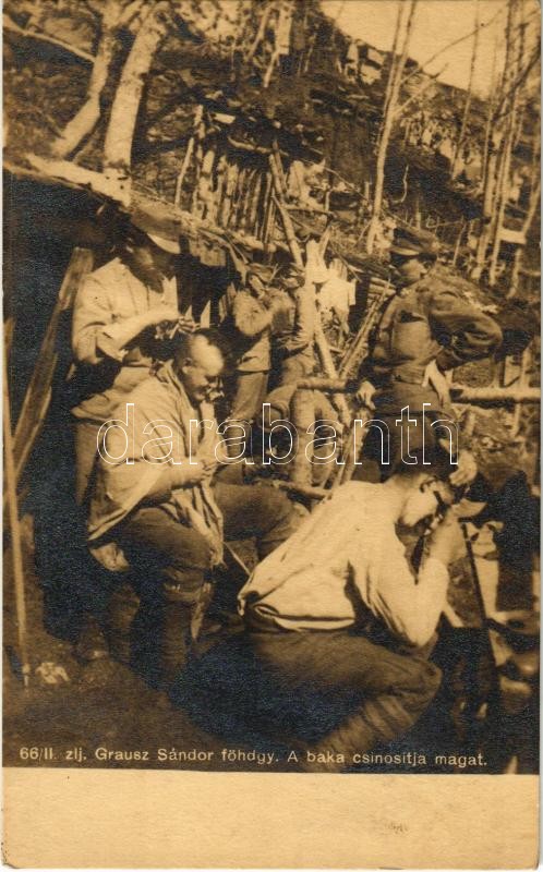 A baka csinosítja magát. 66/II. zászlóalj. Grausz Sándor főhadnagy fel... https://www.darabanth.com/en/36-Major-auction/36.1/Postcards/Militaria~15493/A-baka-csinositja-magat-66II-zaszloalj-Grausz-Sandor-fohadnagy-felvetele-Hadifenykep-K~II2469748