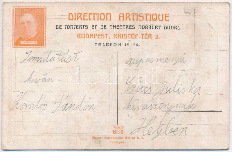 Description: Sasa Colbertson amerikai hegedűművész hangversenyének műsora. Direktion Artistique Dunkel (Dunkl) Norbert Budapest. Szecessziós kinyitható reklám / Concert program of the American violinist, Sasha Alexander Culbertson. Art Nouveau folding advertising postcard (gyűrődés / crease)