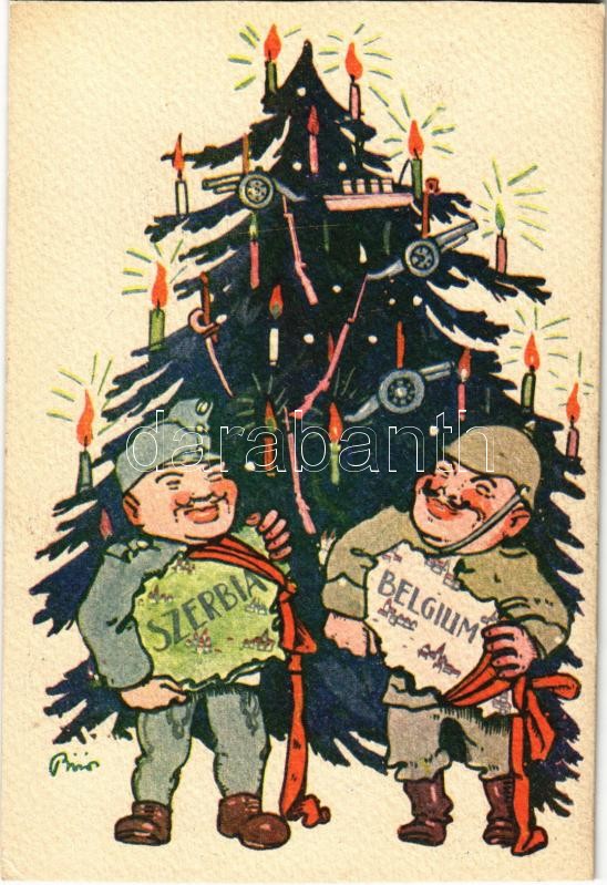 Description: Első világháborús gúnyos katonai propaganda lap, Belgium és Szerbia elfoglalása, Karácsonyi ajándék. Magyar Földrajzi Intézet Rt. kiadása / WWI sarcastic military propaganda card, Capturing of Belgium and Serbia as Christmas present s: Bíró