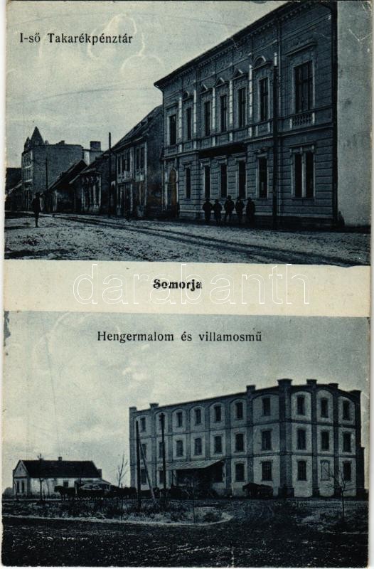 1916 Somorja, Somorin, Samorín; Első takarékpénztár, Hengermalom és villamosmű. Goldstein József kiadása / savings bank, mill and power plant