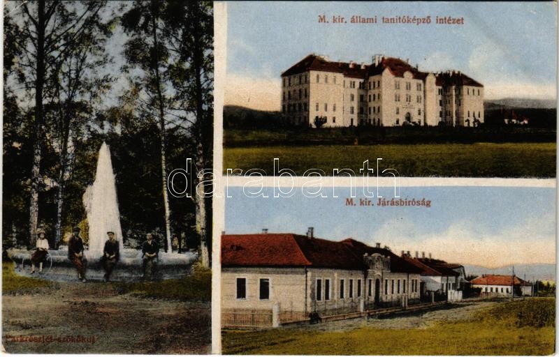 Description: 1917 Stubnyafürdő, Túróchévíz, Stubnianske Teplice, Turcianske Teplice; Tanítóképző intézet, járásbíróság, park és szökőkút. Kiadja Kohn Edéné / teacher training school, court, park and fountain (EK)