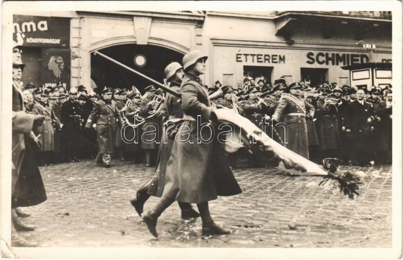 1938 Kassa, Kosice; bevonulás, Ludovikások díszmenete Magyarország Kormányzója (Horthy Miklós) előtt, Schmied étterem, fölgyfodrászat. Foto Ginzery S. 3. sz. / entry of the Hungarian troops, restaurant, hairdresser + "1938 Kassa visszatért" So. Stpl (EK)