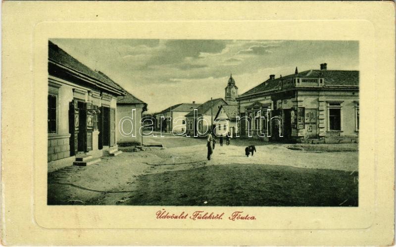 Fülek, Filakovo; Fő utca, Lisztraktár a Menyecskéhez, Kálmán József üzlete, dohánytőzsde. W. L. Bp. 5966. / main street, flour warehouse, shops