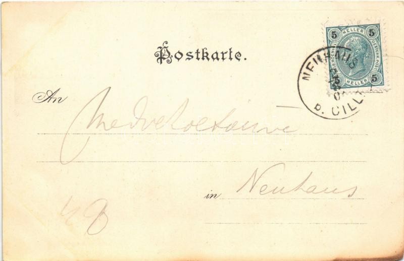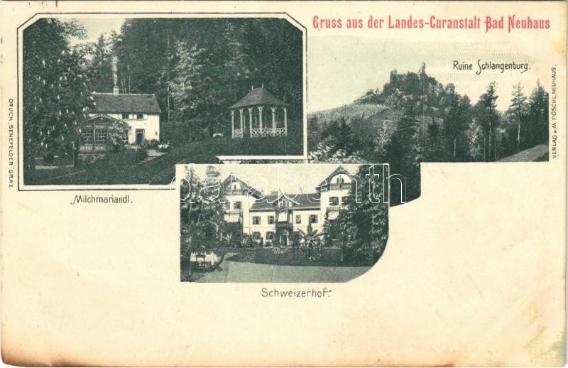 Description: 1901 Terme Dobrna, Bad Neuhaus bei Cilli; Milchmariandl, Ruine Schlangenburg, Schweizerhof / spa, bath, hotel, castle ruins. Druck Senefelder. Verlag v. M. Pöschl (worn corner)