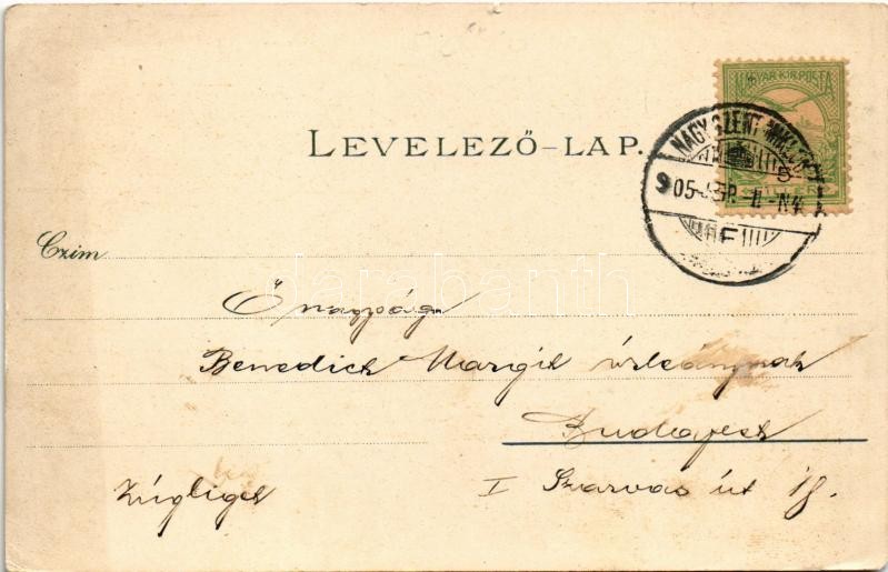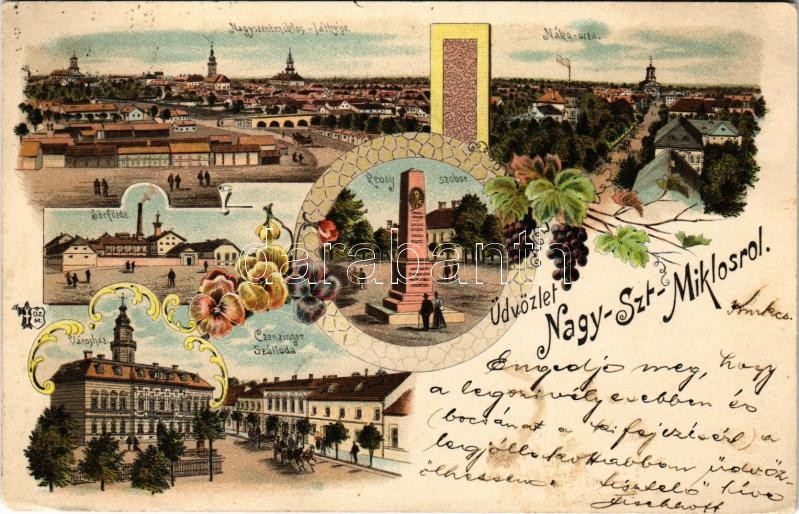 1905 Nagyszentmiklós, Sannicolau Mare; Náko utca, Sörfőzde, városház, Czenzinger szálloda, Révay szobor / street, town hall, brewery, hotel, statue. Art Nouveau, floral, litho (EK)