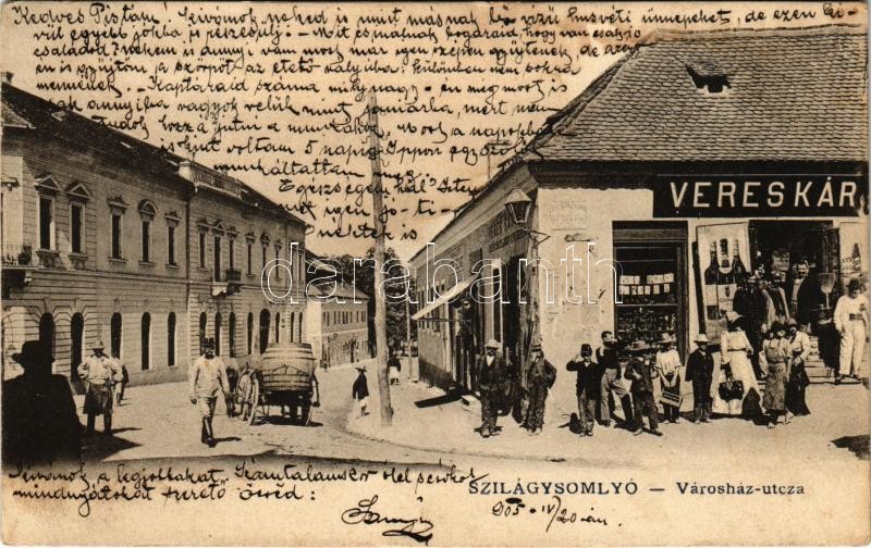 https://www.darabanth.com/en/36-Major-auction/36.1/Postcards/Transylvania~15418/1905-Szilagysomlyo-Simleu-Silvaniei-Varoshaz-utca-Varosi-szalloda-ferfi-szabo-Veres-Ka~II2486439