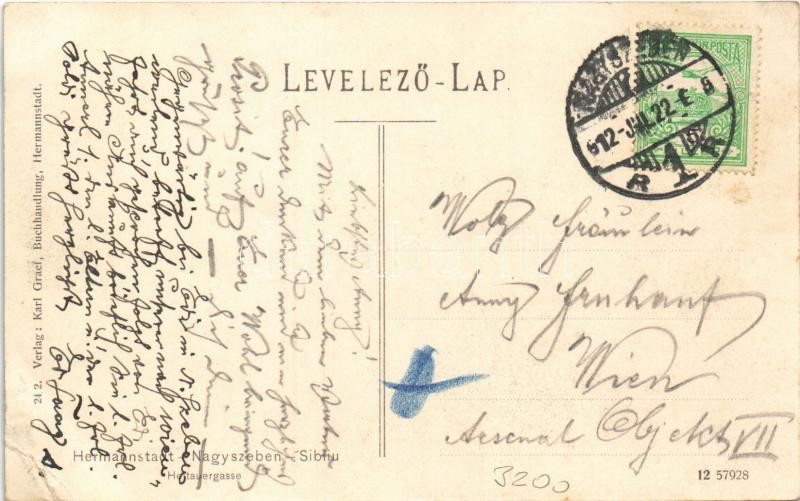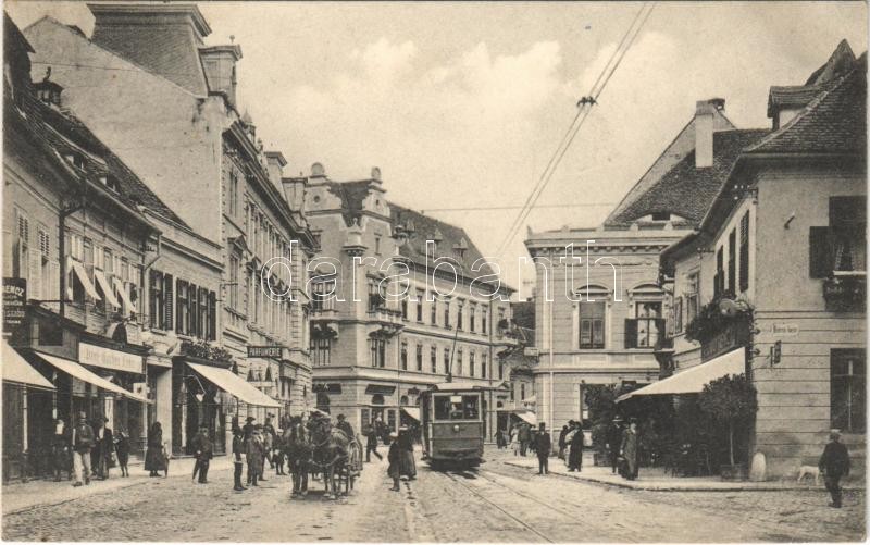 1912 Nagyszeben, Hermannstadt, Sibiu; Disznódi utca, villamos, illatszertár, üzlet, Három Tölgy söröző. Karl Graef 2412. / Heltauergasse, Drei Eichen Bräu / street, perfume shop, beer hall, tram (EK)