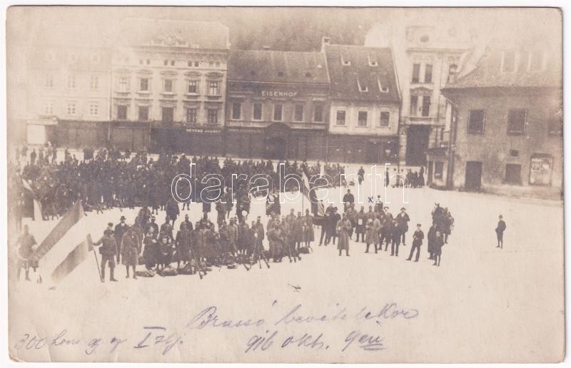 Description: 1916 Brassó, Kronstadt, Brasov; 300. honvéd gyalogezred I. zászlóalj katonái a város bevételekor a Fő téren október 9-én, csoportkép zászlókkal, Eisenhof és Révész József üzlete / WWI military, entry of the K.u.k. troops in October 9, soldiers' group with flags on the main square, shops. photo