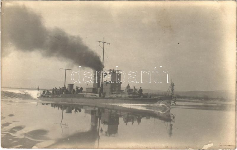 Description: 1923 Magyar Királyi Folyamőrség "KECSKEMÉT" (ex SMS Viza) WELS típusú őrnaszádja matrózokkal a fedélzeten egy próbaúton / Hungarian Royal River Guard ship "KECSKEMÉT", mariners on deck. photo