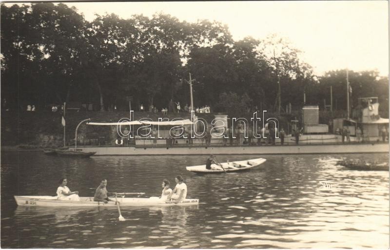 Description: 1925 Baja, Magyar Királyi Folyamőrség "SZEGED" (ex SMS Wels) őrnaszádja a kikötőben, csónakázók / Hungarian Royal River Guard ship "SZEGED". photo (ragasztónyom / gluemark)
