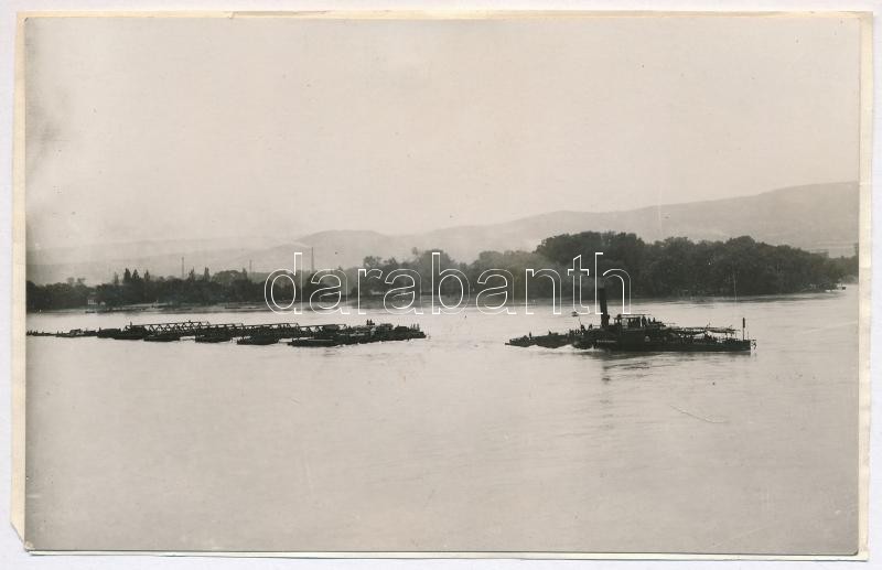 Description: 1926 "BADACSONY" (ex SMS Balaton) oldalkerekes vontató gőzhajó felfegyverkezve aknakeresővé Magyar Királyi Folyamőrség kötelékében. Ragasztott fotó / Hungarian Royal River Guard ship "BADACSONY". Glued photo