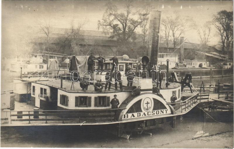 Description: "BADACSONY" (ex SMS Balaton) oldalkerekes vontató gőzhajó felfegyverkezve aknakeresővé Magyar Királyi Folyamőrség kötelékében, matrózok pózolnak a fedélzeten / Royal Hungarian River Guard ship "BADACSONY", mariners posing on deck. photo (ragasztónyom / gluemark)