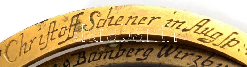 Description: cca 1750 Merdián gyűrű. Időmérő és csillagászati műszer. "Cristoff Schener Augsp". jelzéssel. A mozgatható réz gyűrűkön városnevekkel, égövi jegyekkel és óra beosztással. / 18th Century German brass equinoctial ring dial from Augsburg, d:6,4 cm