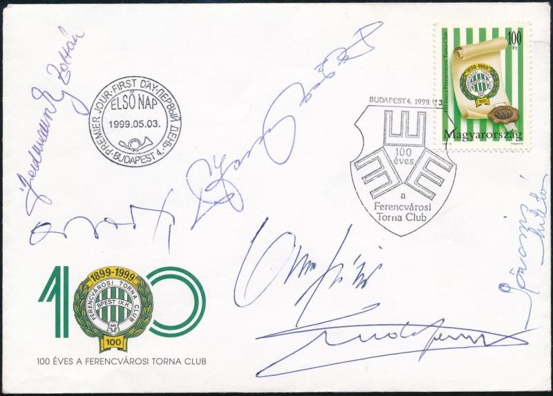 Description: 1999 Friedmanszky Zoltán (1934-), Orosz Pál (1934-2014), Ombódi Imre (1927-1996), Rudas Ferenc (1921-2016), Páncsics Miklós (1944-2007), Dr. Fenyvesi Máté (1933-) FTC-s labdarúgók aláírásai egy 100 éves az FTC FDC borítékon.