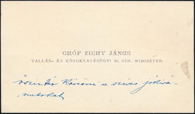 cca 1900 gr. Zichy János vallás és közoktatásügyi miniszter saját kézírásával írt üzenete névjegykártyáján