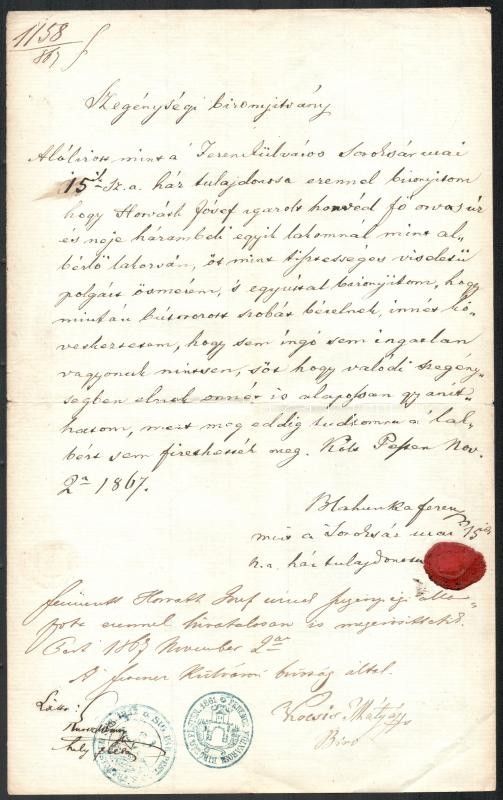 1867 Pest, Szegénységi bizonyítvány, viaszpecséttel