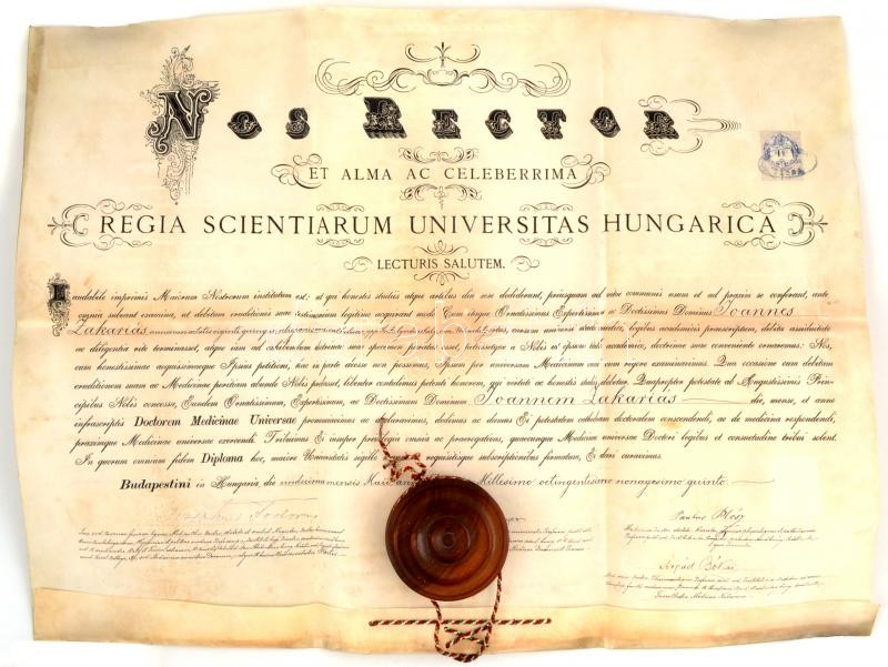 1894 Dekoratív pergamen orvosi diploma, teljesen ép függő viaszpecsétt... https://www.darabanth.com/en/360-Online-auction/360.0/Art-and-other-collectibles/Documents~500017/1894-Dekorativ-pergamen-orvosi-diploma-teljesen-ep-fuggo-viaszpecsettel-rajta-Fodor-Jozsef-~II2072824