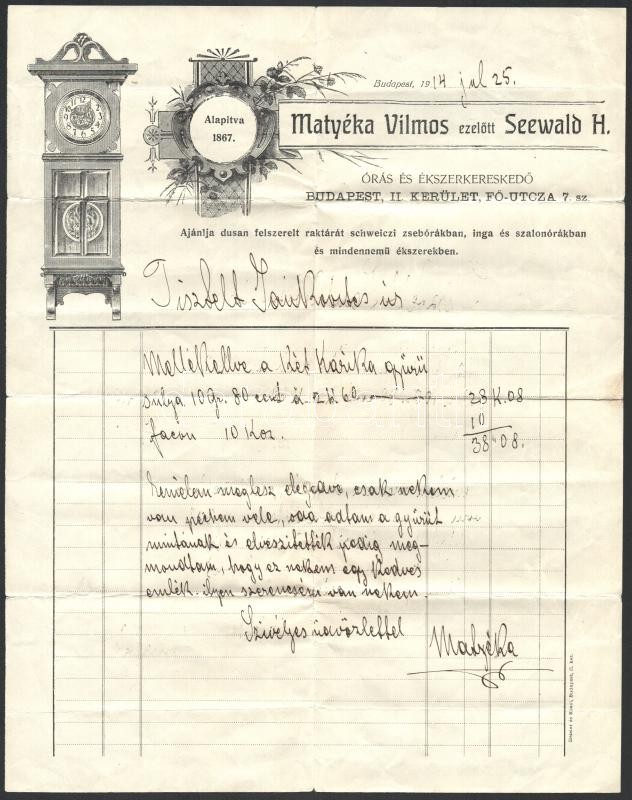 1914 Bp. II., Matyéka Vilmos, előtte Seewald H. Órás és Ékszerkereskedő fejléces számlája