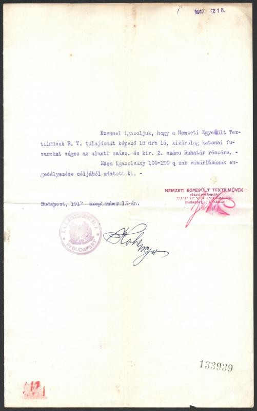 https://www.darabanth.com/en/360-Online-auction/360.0/Art-and-other-collectibles/Documents~500017/1917-Bp-Nemzeti-Egyesult-Textilmuvek-altal-kiallitott-igazolas-katonai-fuvarozasrol~II2073626