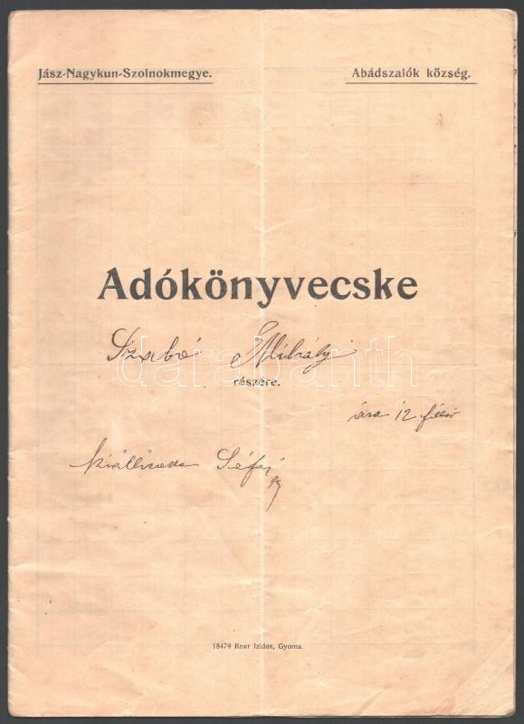 cca 1920 Abádszalók, községi mezőőr adókönyvecskéje