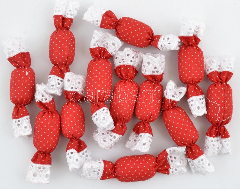 Csipkés, piros alapon fehér pöttyös textil szaloncukor, 12 db, h: 12 c...