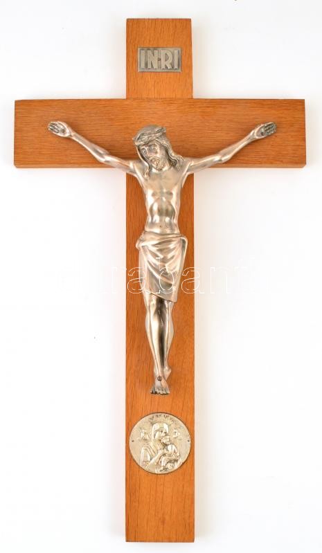 Fa feszület fém Krisztussal és Szűz Mária a kis Jézussak plakettel, 49...